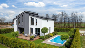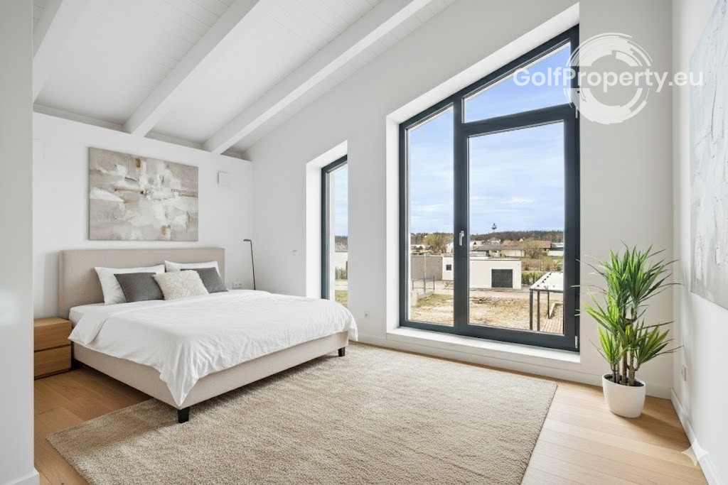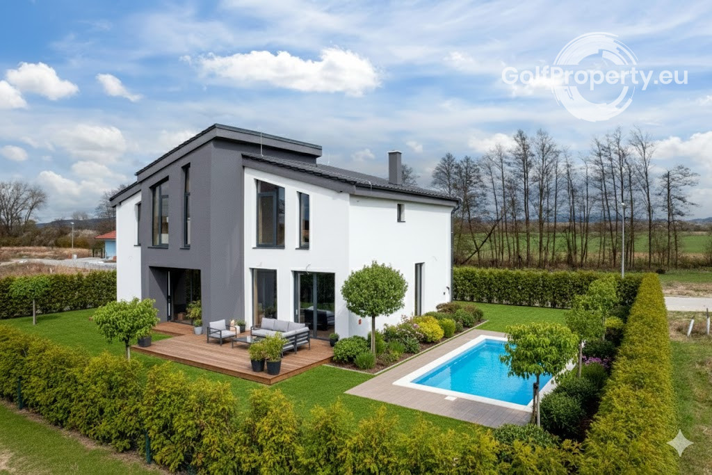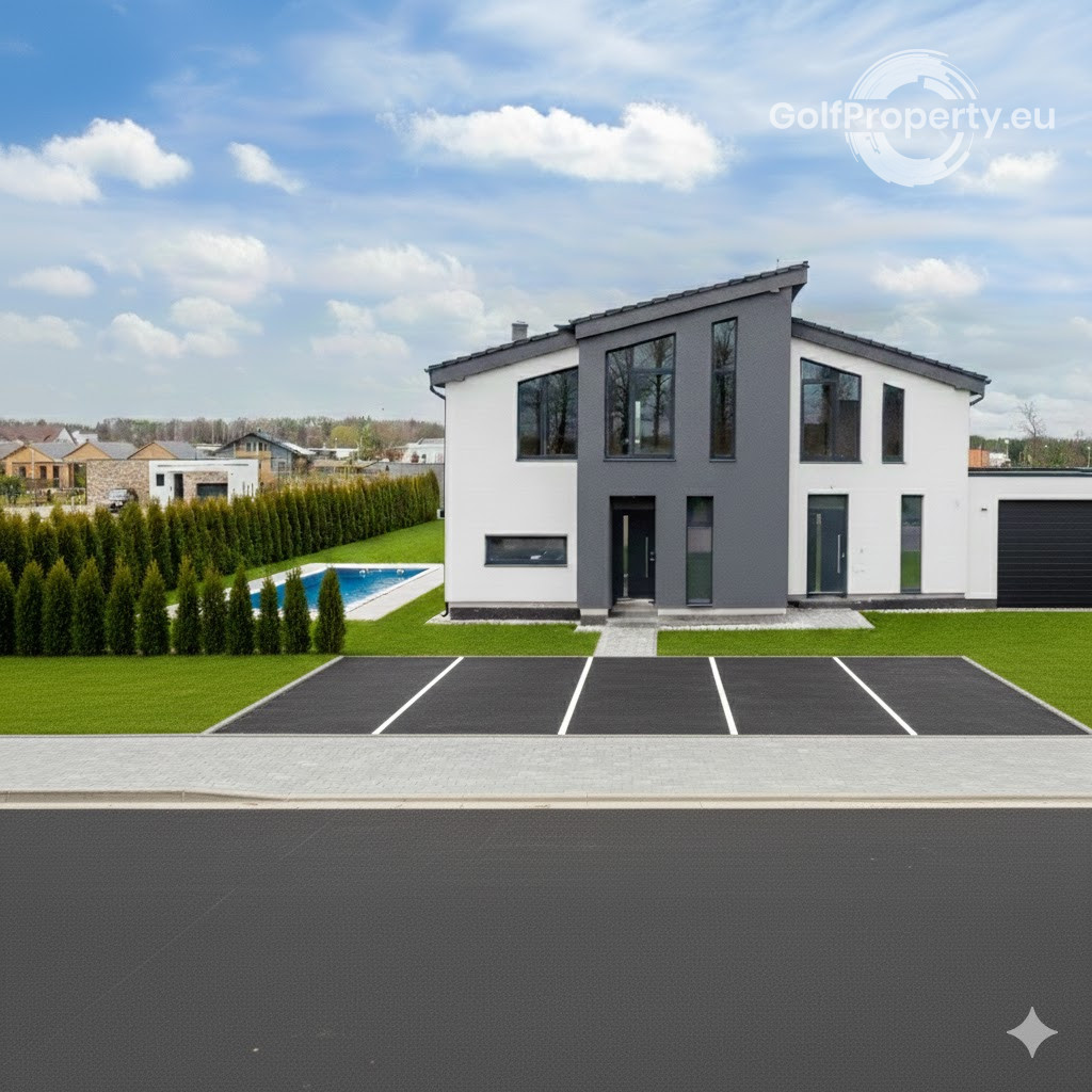 The exterior is completed and the plot is fully fenced. There is space for a swimming pool, a spacious terrace, and parking for up to 4 cars. The interior can be finished according to your own preferences. An excellent investment in a rapidly developing location. The photos are illustrative, showing possible design and completion options. The property is sold as an extended shell construction – interior plaster, flooring, and utility connections need to be completed. Preparation for underfloor heating is already installed. A heat pump is included in the price.